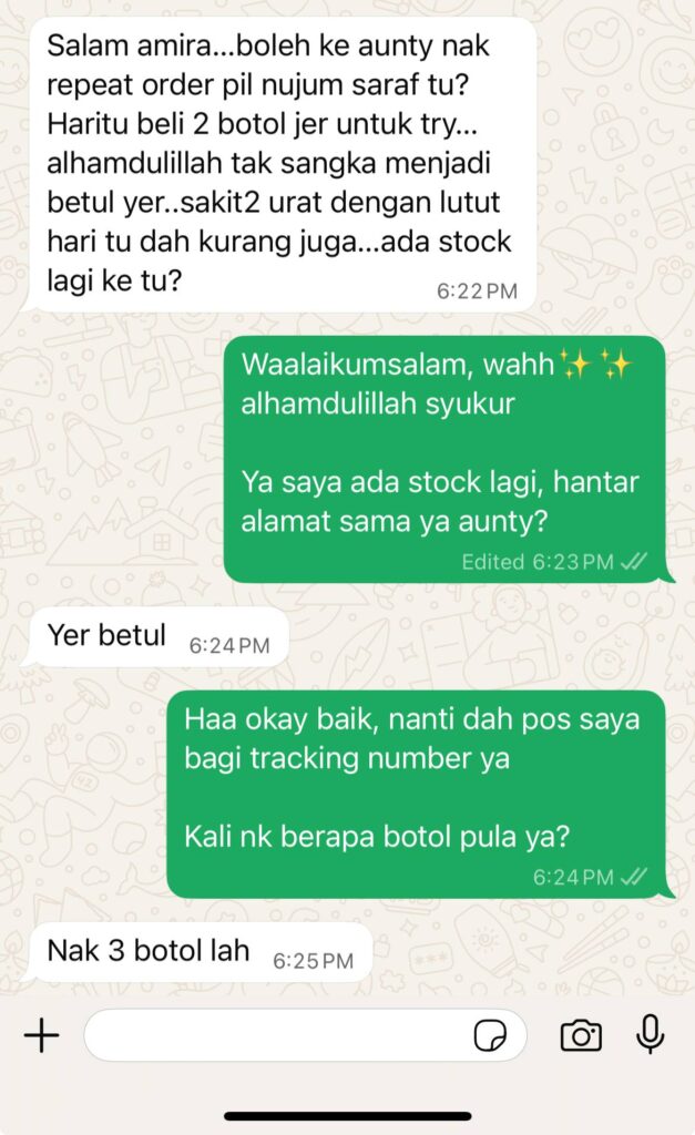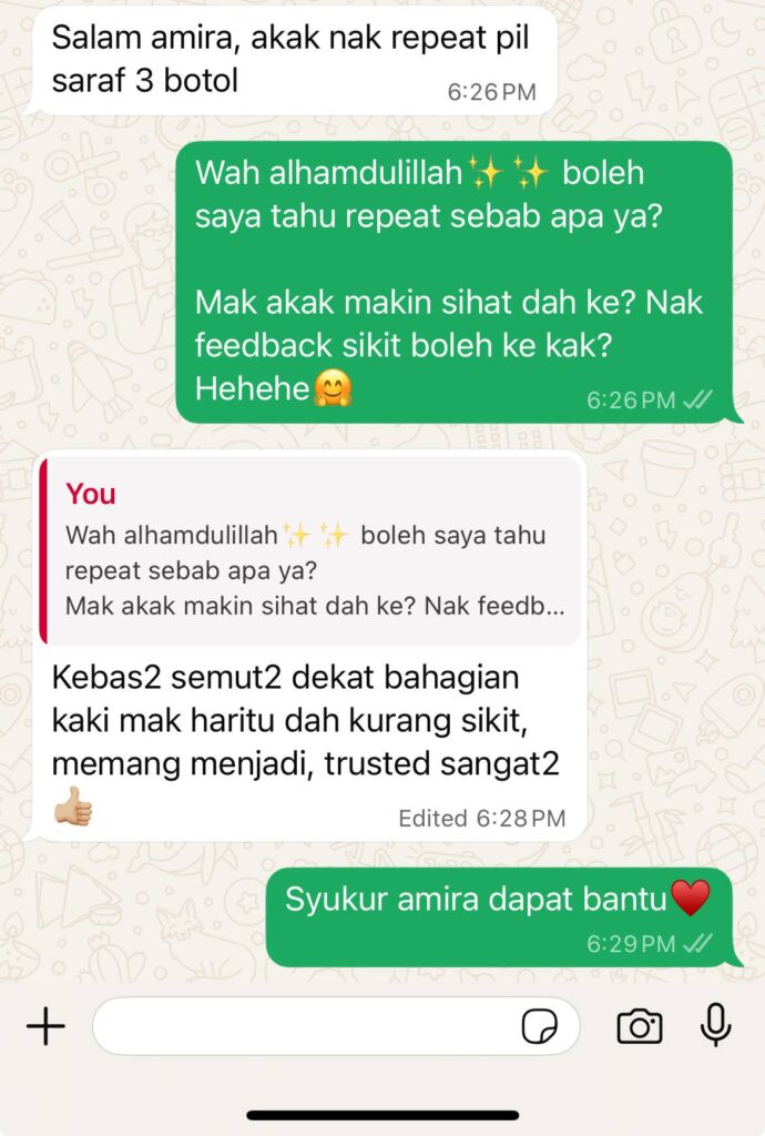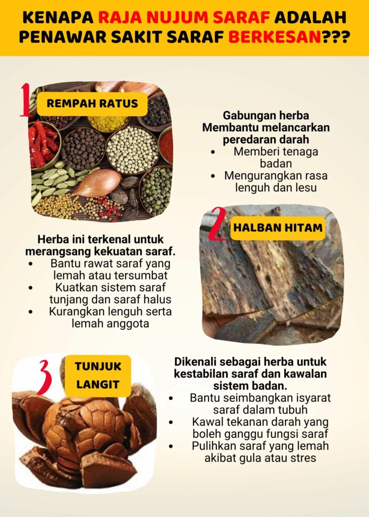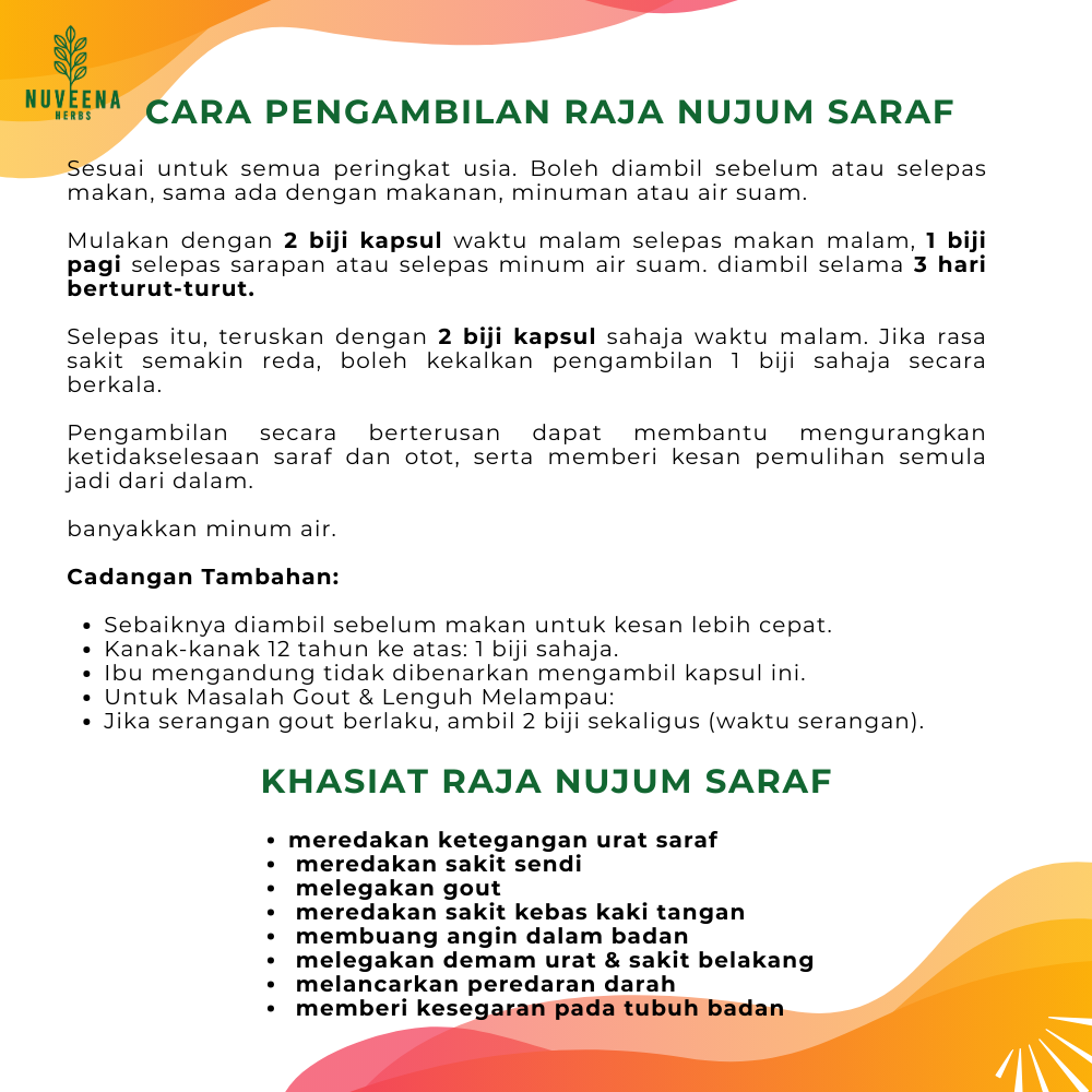 Dengan penggunaan gabungan herba terpilih khas untuk sakit saraf, ada herba yang sukar ditemui, ada yang tumbuh di kawasan tertentu sahaja, dan ada pula yang memerlukan proses peraman berminggu-minggu untuk memastikan khasiatnya benar-benar meresap. Kami memilih setiap herba dengan teliti bagi menghasilkan formula rawatan sakit saraf yang berkesan dan selamat digunakan!
